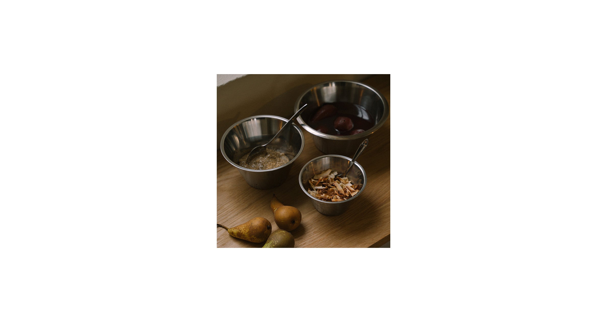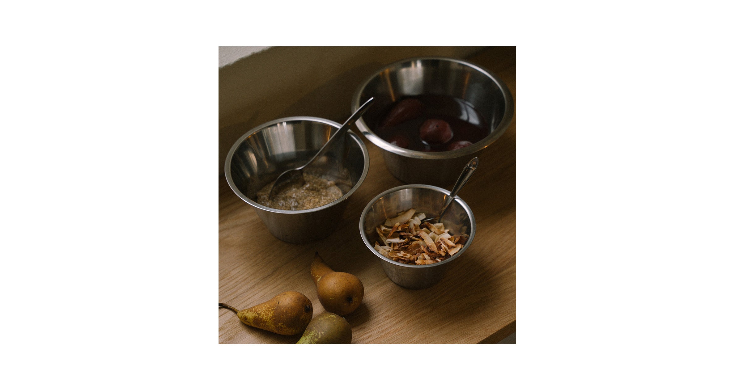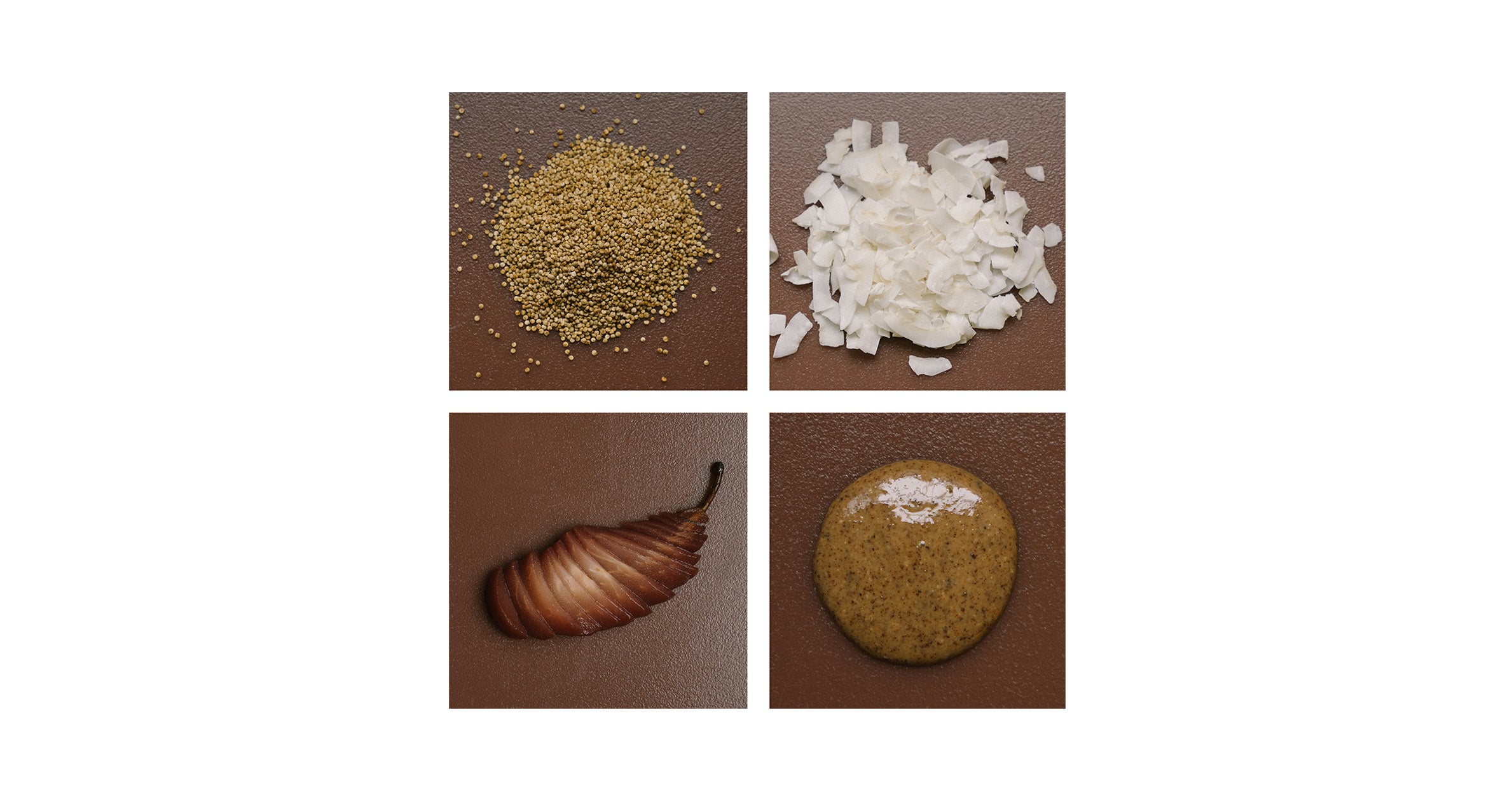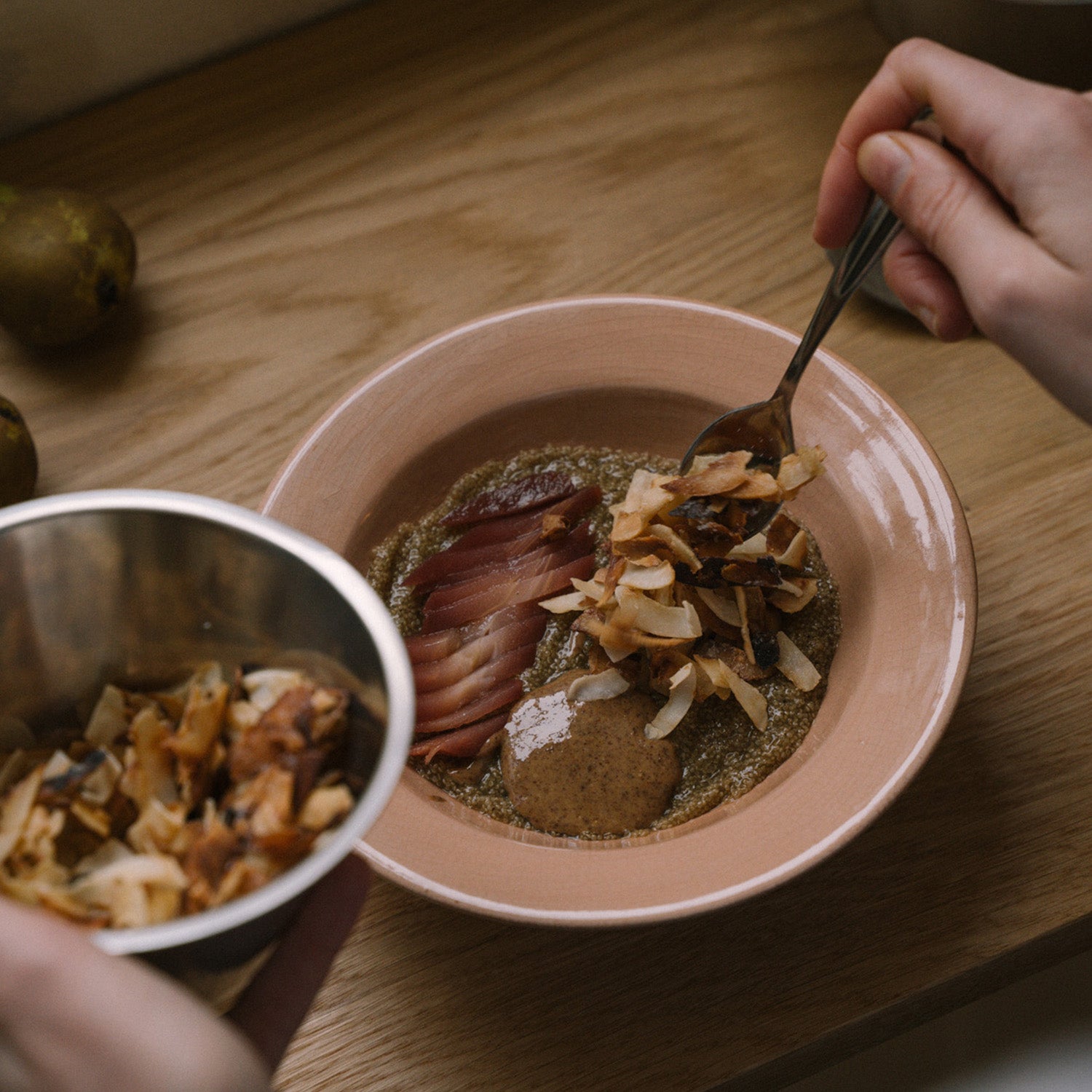 This warm porridge is made from slowly cooked amaranth and finished with hojicha for a gentle roasted depth. It’s topped with softly poached pears and a coconut crunch made from coconut flakes, coconut oil, maple syrup, anise, and sea salt. A grounding, comforting dish designed to nourish deeply without feeling heavy.