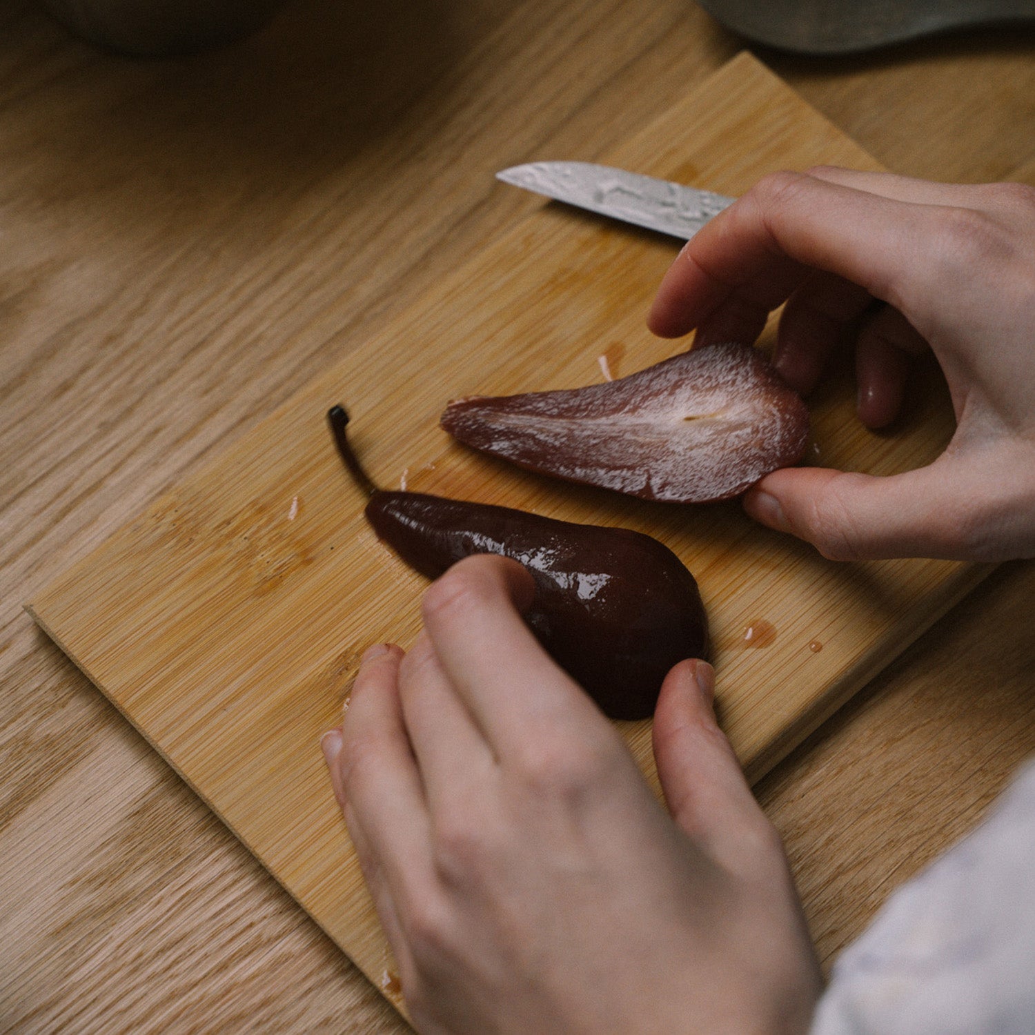 Simmer gently for 10–15 minutes, uncovered, until soft and naturally red. Let the pears sit in the liquid for deeper color. Remove hibiscus before serving. (Pears keep well in the fridge for 3–4 days.)