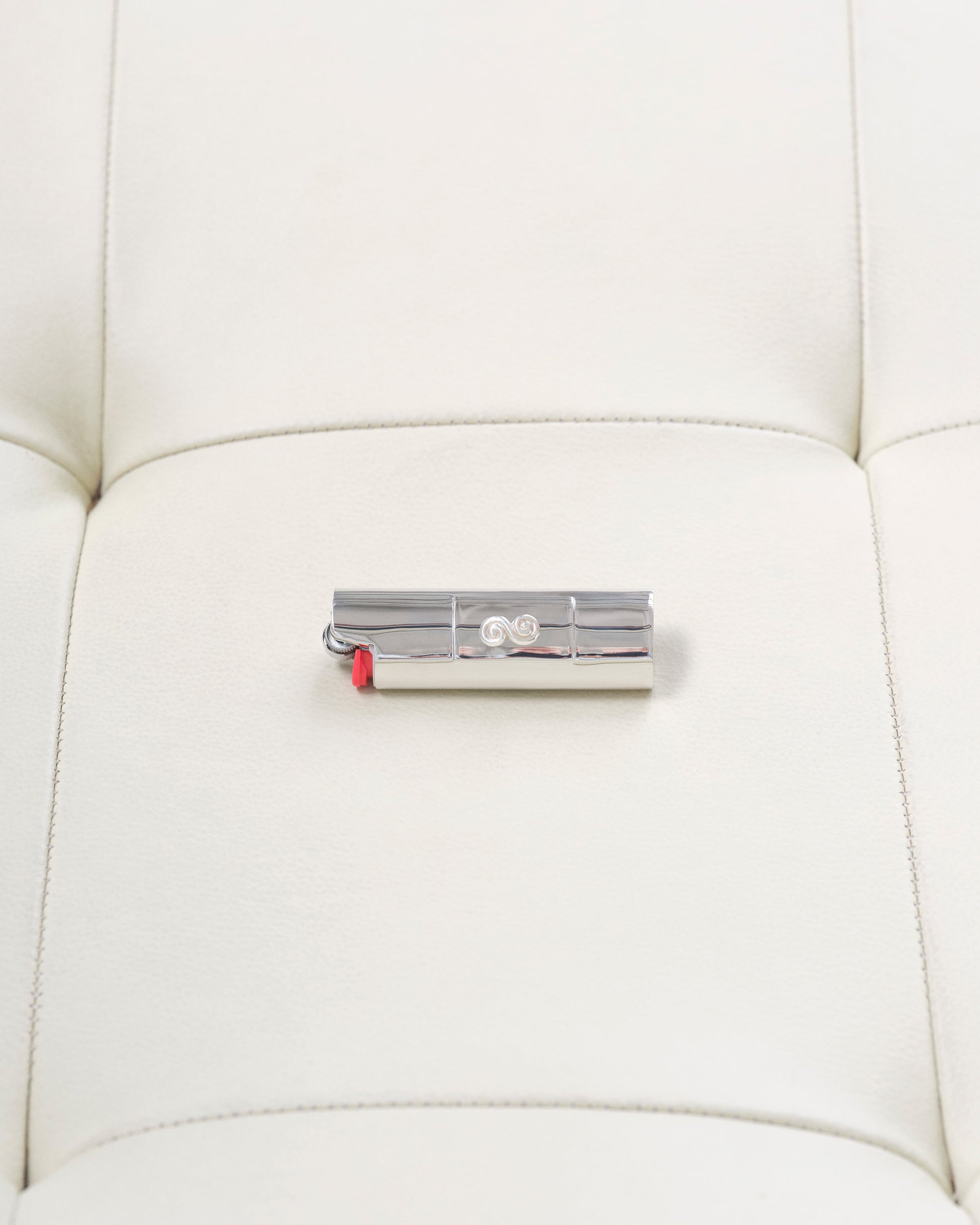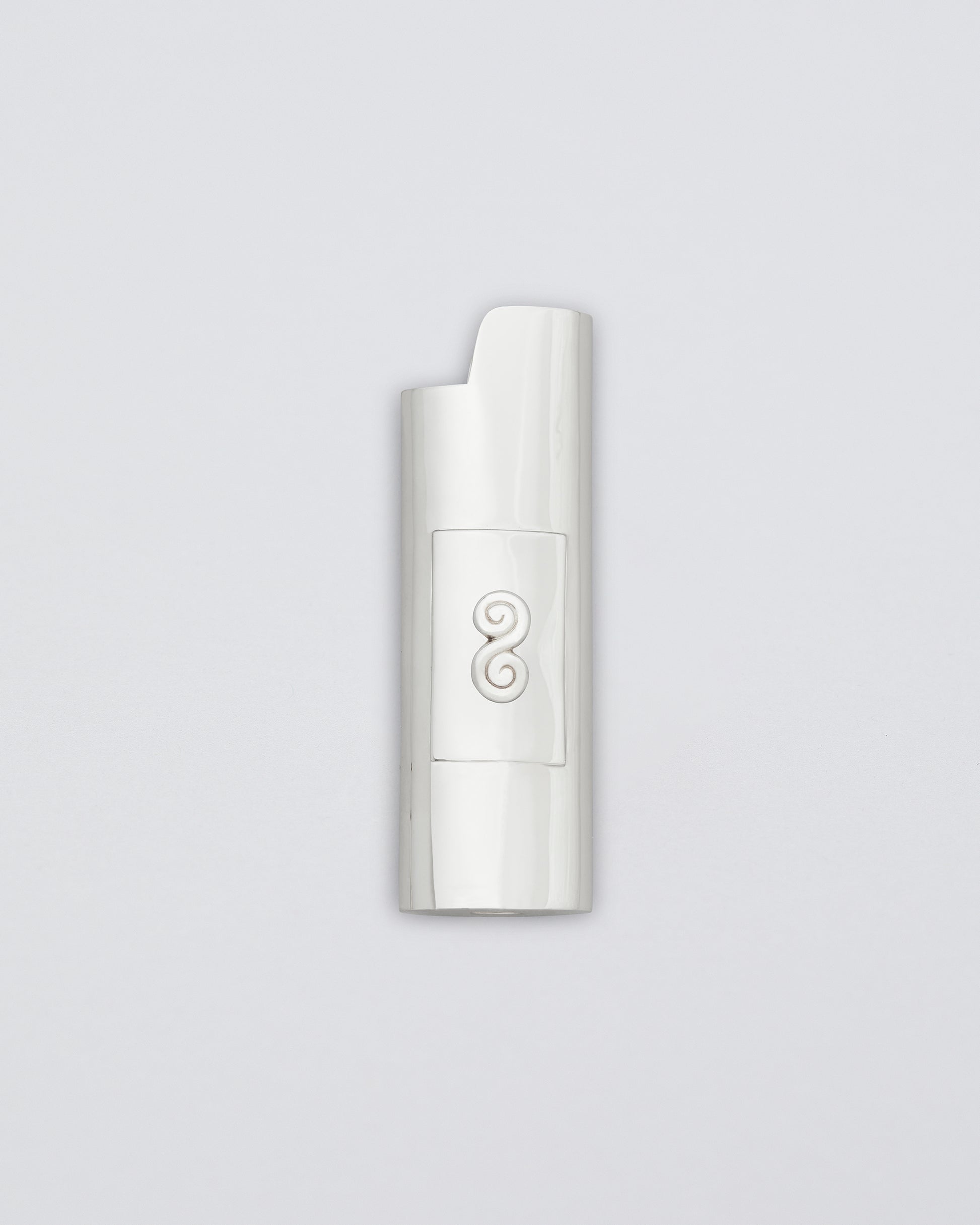 Eternity Lighter Case is crafted in brass with a platinum finish, featuring a sculptural swirl shaped in continuous motion. It is meant to stay in a particular place in the home - an object with presence and purpose, merging function with form.
