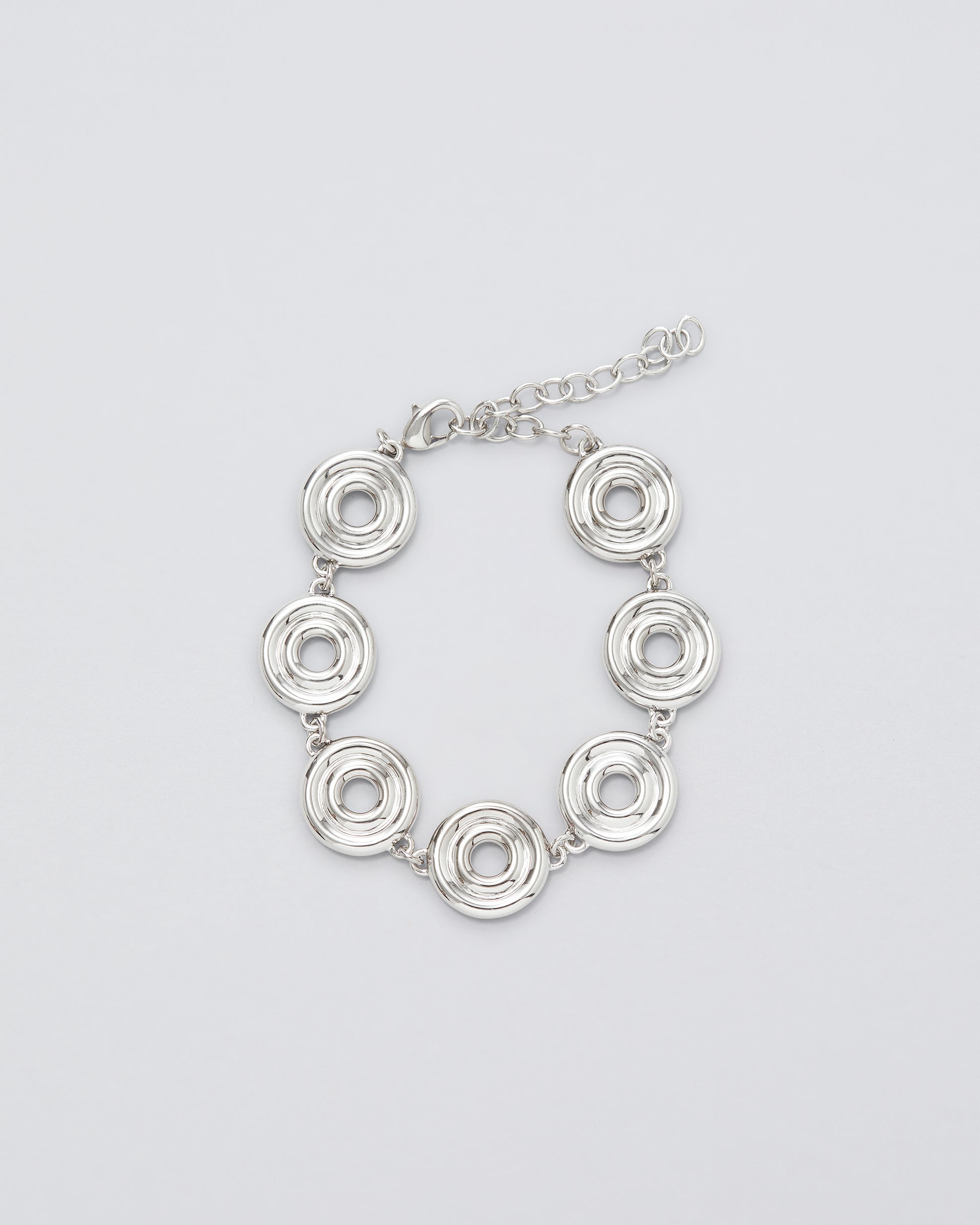 Merged Bracelet is crafted in brass with a platinum finish. Its circular links create a rhythmic composition that feels both sculptural and fluid. The repeating forms reflect connection and continuity.