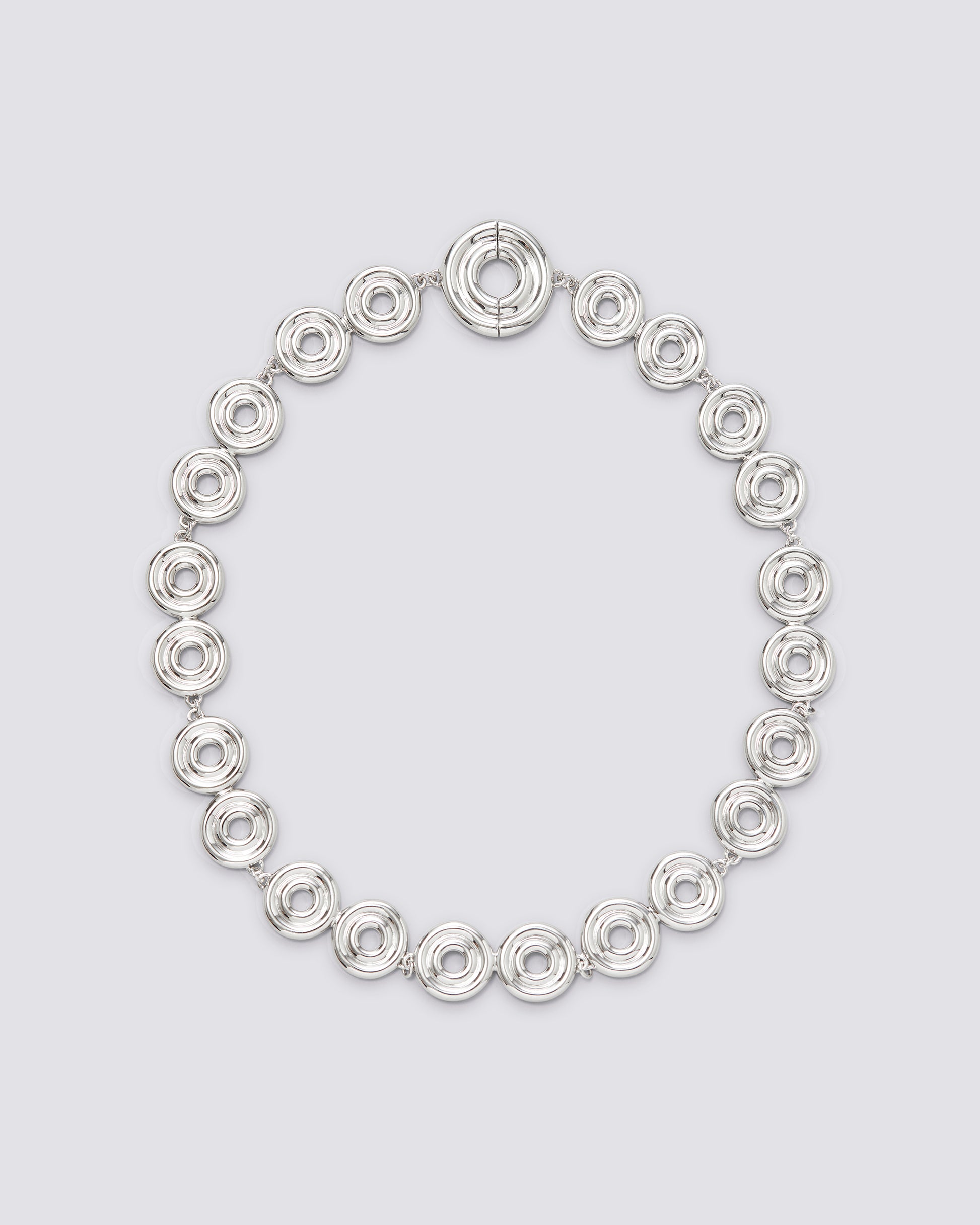 Merged Necklace is crafted in brass with a platinum finish. Its circular links form a continuous rhythm, symbolizing connection and the imprint we leave on one another. The way the necklace is designed allows the links to move, so it lays beautifully along the collarbone.