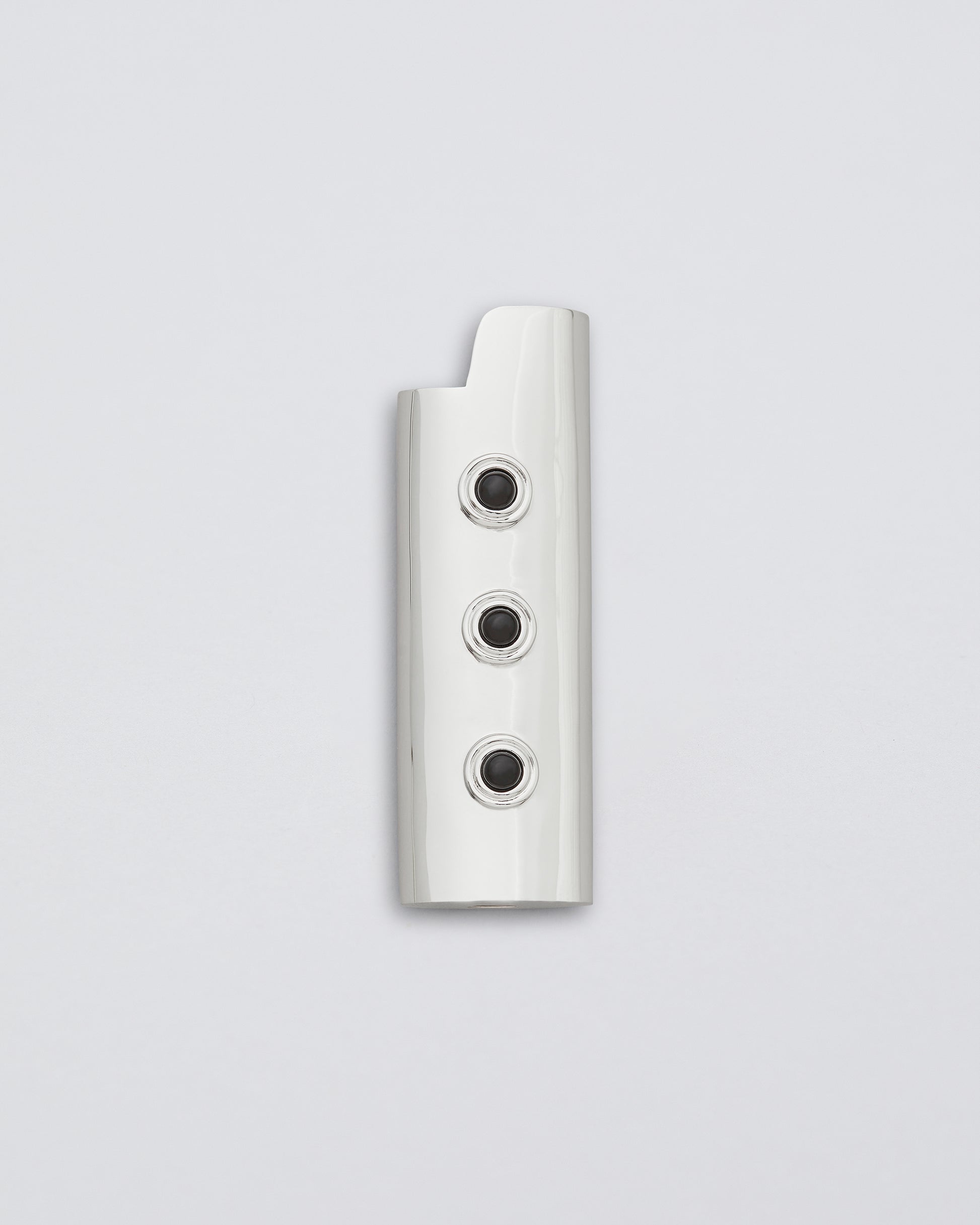 The Moments lighter case is crafted in brass with a platinum finish and features three Onyx Stones set in a repeating pattern. It is meant to live in a special place in the home - an object with both physical presence and purpose, merging function with form.