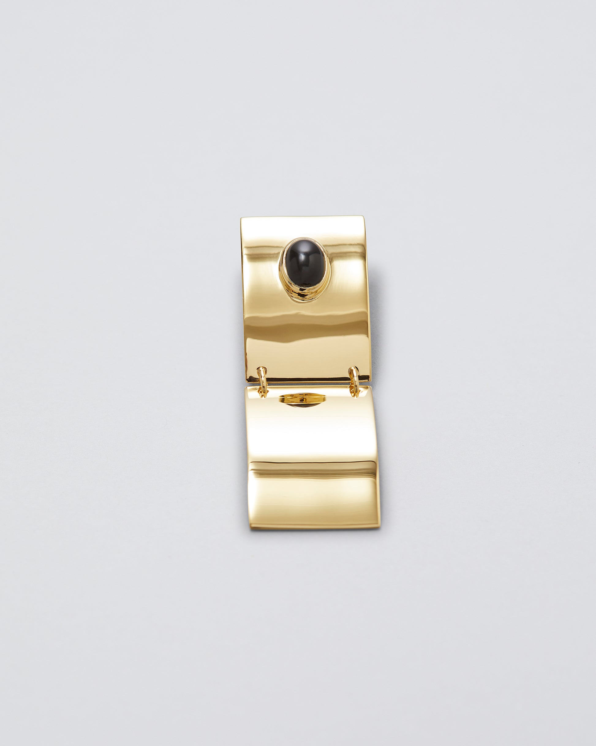 Reframe Earring is crafted in 925 sterling silver with a 14k gold-plated finish. Its clean form creates a sense of balance and structure, contrasted by the Black Onyx. The two surfaces are connected with jump rings, allowing the earring a sense of movement.